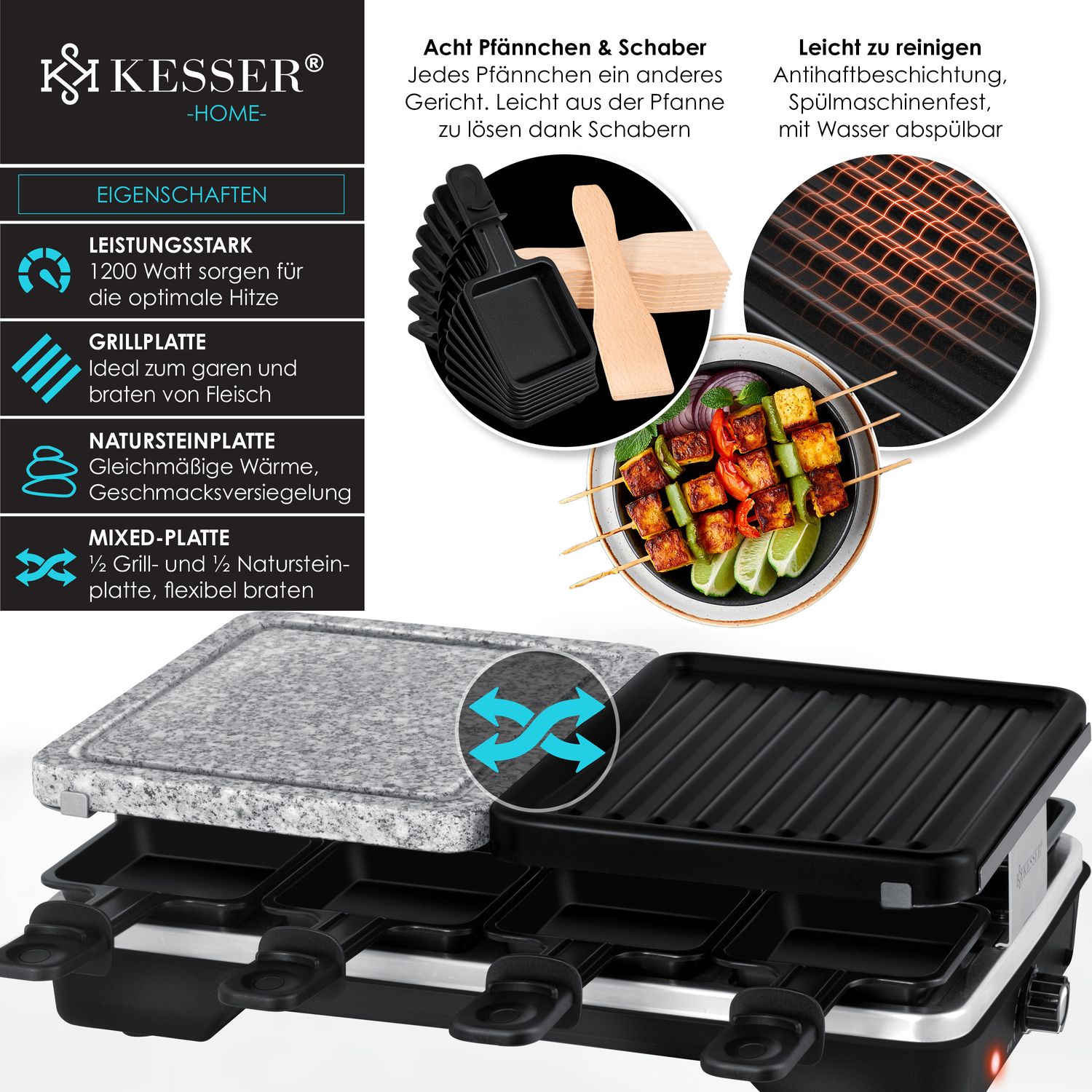 Kesser Raclette Grill Mit Naturgrillstein Grillplatte Tischgrill Fur 8 Personen Elektrogrill Raclette Grill Antihaftbeschichteter Grillplatte 8 Pfannen Und Holzspatel 1200w Online Kaufen Bei Netto